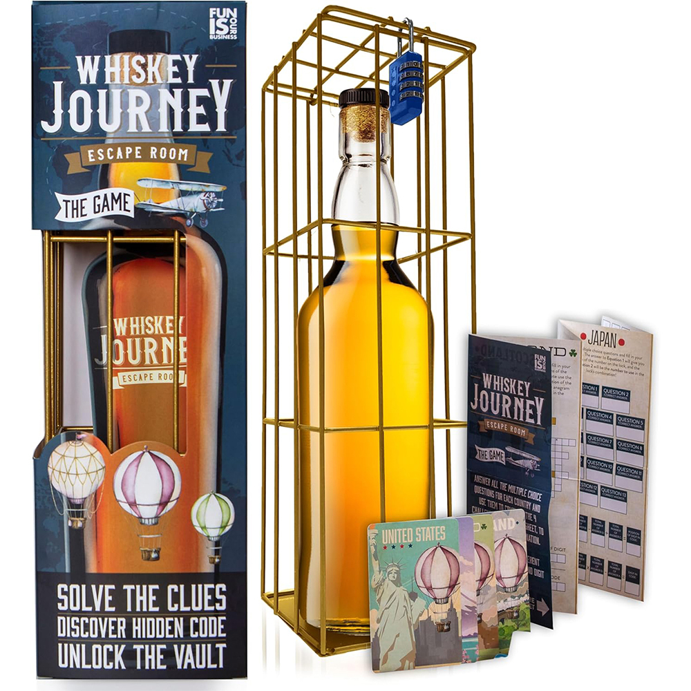 Boxer Gifts Whiskey Escape Room Game turns a bottle of whiskey into an adventure. The set comes with a golden metal cage, combination padlock, and over 50 quiz-style question cards about Irish, Scotch, American, and Japanese whiskey. To get the drink inside, players must solve the puzzles and crack the 4-digit code making it a fun and interactive gift for whiskey lovers or adults who enjoy party games. It’s a creative twist on a standard bottle, ideal for birthdays or holidays, transforming a simple drink into a shared challenge and memorable experience. | |