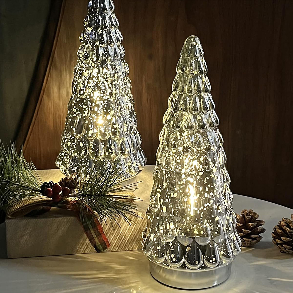 The product a mini battery-operated glass Christmas tree by SHMILMH is a beautiful and compact holiday décor item. Standing about 10″ tall, this silver, mercury-glass tabletop tree comes pre-lit with lights powered by AAA batteries (not included), making it ready to brighten up fireplaces, mantels, tabletops, or cozy corners.Its elegant silver finish and delicate glass design add a festive yet classy charm to any room. Its small size and easy setup make it a great gift or seasonal decoration ideal for those who love subtle holiday décor without the fuss of a large tree. | |