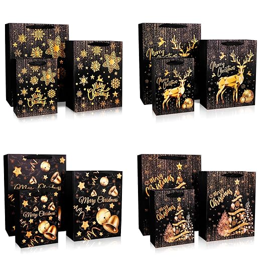 This bundle offers 12 stylish and reusable holiday gift bags in three sizes - 4 Extra Large (16″ × 12.2″ × 4.7″), 4 Large (12.6″ × 10.3″ × 4″), and 4 Medium (9.5″ × 7″ × 3.4″) - perfect for a wide variety of presents. Designed with sturdy handles and sleek black holiday paper, they provide a clean, modern look for festive wrapping. The generous sizing accommodates everything from smaller tokens to larger gifts, making this set ideal for bulk gifting, office parties or family celebrations. It's a practical and elegant solution to simplifying holiday presentation. | |