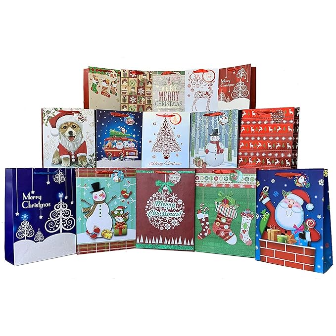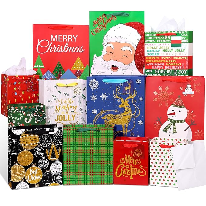 This festive set includes 12 high-quality gift bags in three assorted sizes (Extra Large, Large, Medium), each decorated in cheerful holiday designs. It also comes with 12 matching gift tags and 12 sheets of coordinating tissue paper - everything you need for a polished presentation. The sturdy handles and well-proportioned bags make them ideal for everything from small trinkets to larger presents, whether for office parties, family gatherings, or seasonal gift-giving. Designed for convenience and style, this set streamlines your holiday wrapping while maintaining a coordinated, festive look. | |